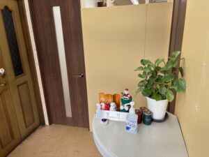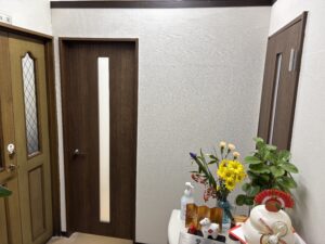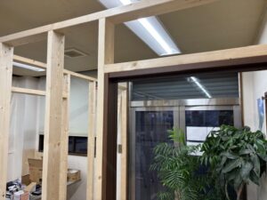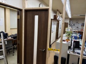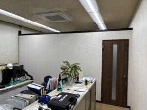 従来は入り口を開けると事務所全景が見渡せましたが、パーティションで仕切りを施工しエントランスと事務所の区別化を施しました。