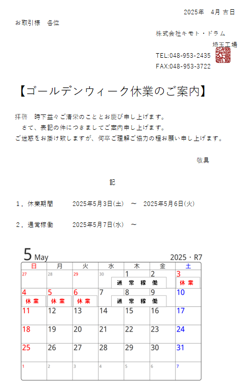 ~4月、5月営業日のお知らせ~